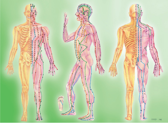 Durch den Körper ziehen sich zwölf Hauptmeridiane. Zugeordnet ist jedem ein Organ. Angesiedelt entlang der Meridiane sind die 400 primären Akupunkturpunkte. Die Meridianebene teilt den Körper in die rechte und linke Hälfte und bleibt von Strömen ausgespart.